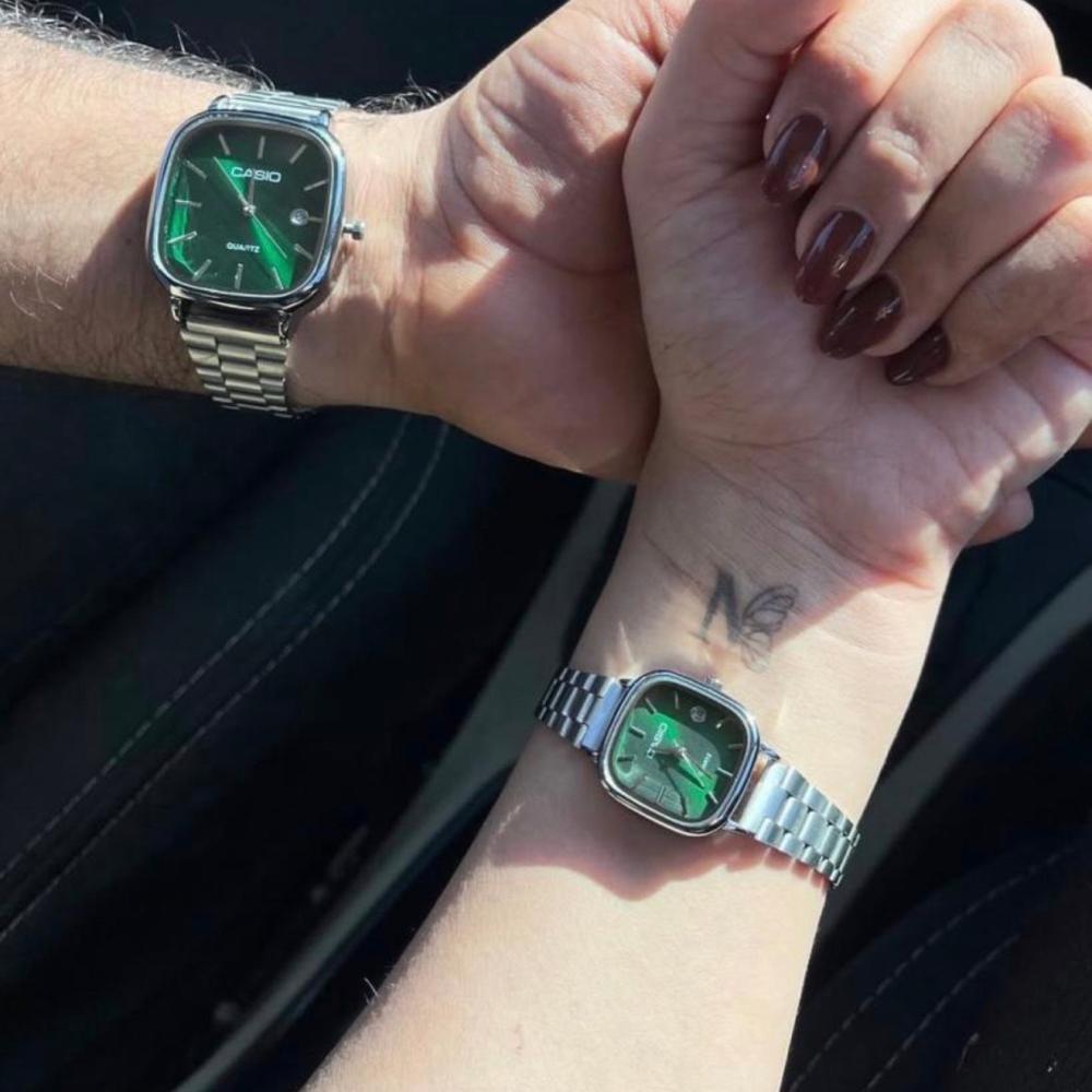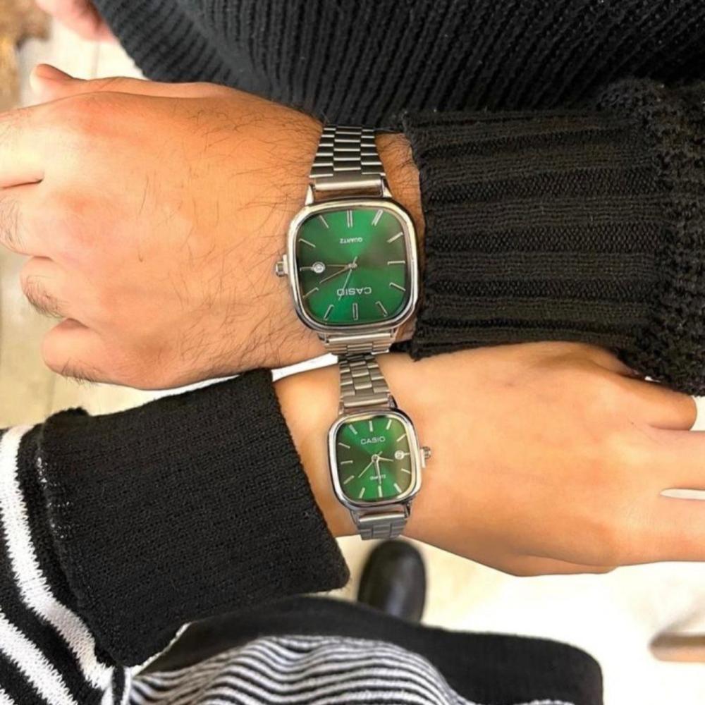 طقم ساعات CASIO الأنيق بلونه الأخضر الملكي يعكس روح التميّز والتفرّد. تصميم يجمع بين الفخامة والبساطة ليكون اللمسة التي تُكمل أناقتكما معًا.